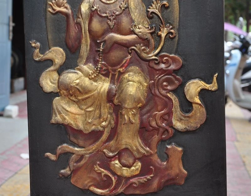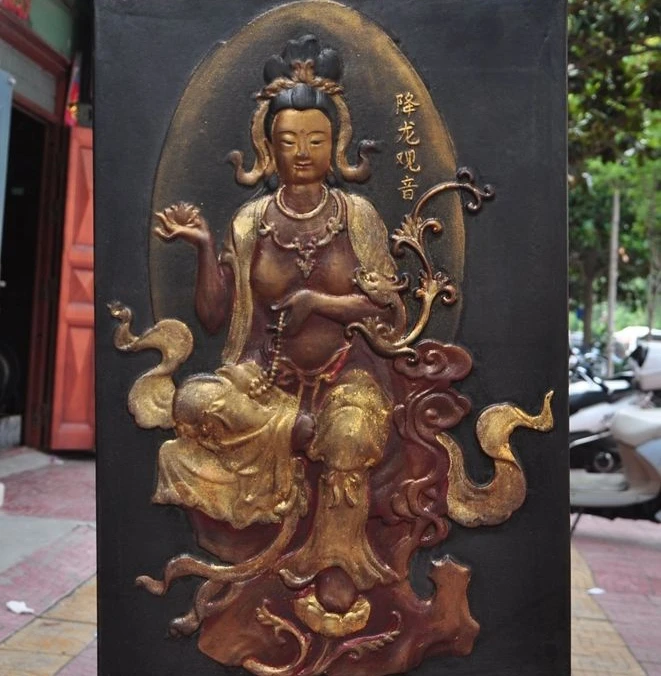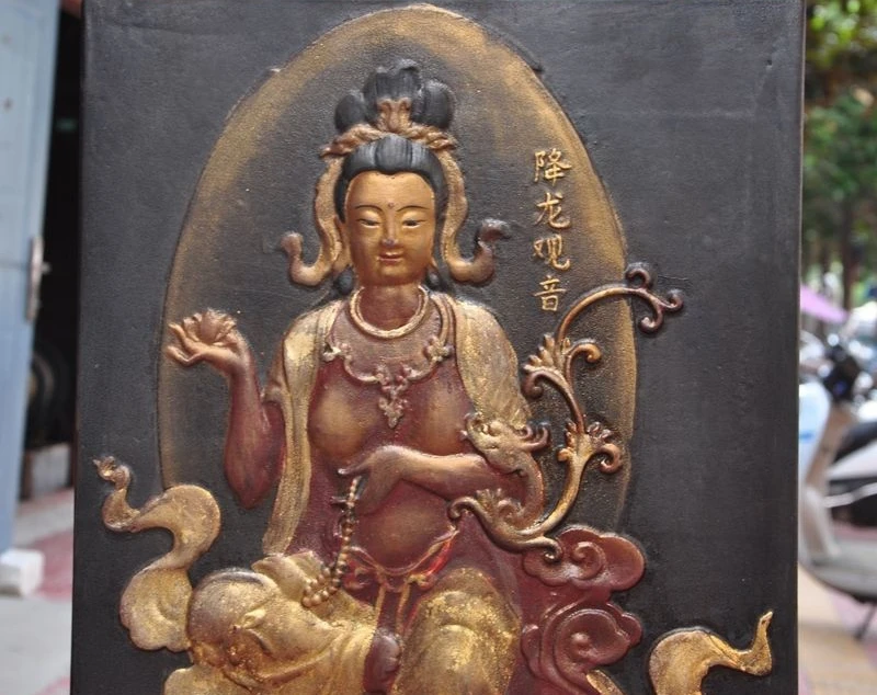 Review Old Chinese lacquerware Wood Dragon Guanyin Kwan-yin Statue Tangka Wall hangingA